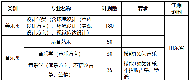 报考我校美术类专业和音乐类专业的考生须参加山东省2023年普通高等学校招生艺术类专业统一考试,且专业成绩和高考文化成绩均达到相应本科合格线。